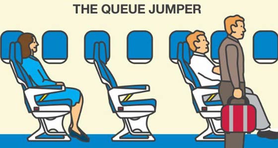 الوقوف في أول الطابور: ويتسبب قفز المسافرين للوقوف في أول الطابور عندما تحط الطائرة على أرض المطار، بإزعاج 35 في المائة من الأشخاص الذين شملهم الاستطلاع