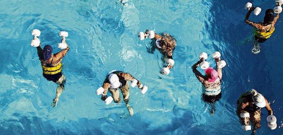يعرفها الجميع باسم الأيروبيكس المائي، وتعد من التمارين الخفيفة واللطيفة والمهمة بالنسبة للمفاصل، وتساهم في حرق السعرات الحرارية، كما أنها تشكل فرصة مناسبة للاسترخاء.