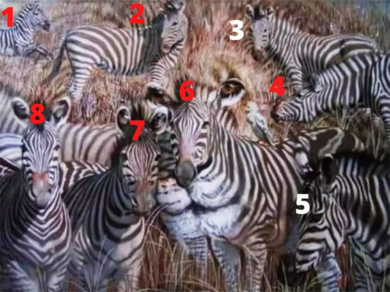- الحمير الوحشية: فإذا رأيت الحمير الوحشية أولا في هذه الخدعة البصرية، فأنت على الأغلب تتمتع بشخصية جذابة ومؤثرة ولديك حس الفكاهة وتكره الملل. فأنت تميل إلى الشعور بعدم الأمان عندما تكون بمفردك. وعادة ما ينجذب الناس إلى مهارات الاتصال الخاصة بك، التي لا تشوبها شائبة وشخصيتك الخارجية الجذابة.