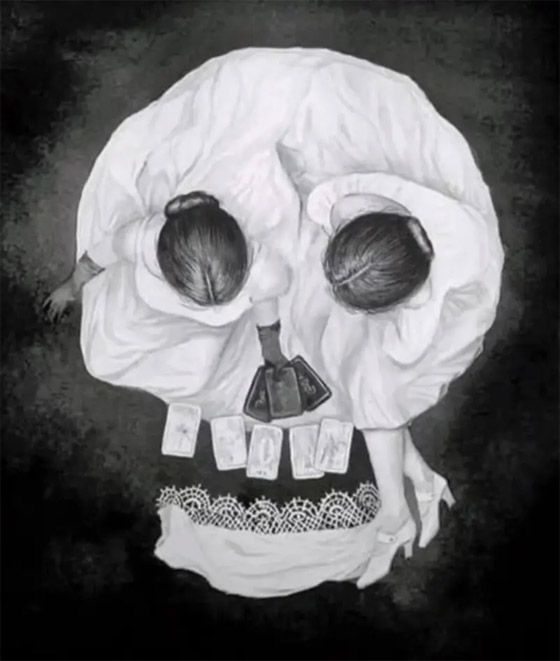 في التفاصيل تظهر الصورة بالأبيض والأسود فتاتين ترتديان ثياباً بيضاء وتلعبان الورق. غير أن البعض رصدوا الجمجمة التي تشكلها فساتين وأرجل الفتيات.