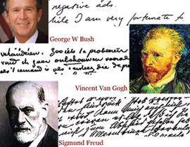 وتشير دراسات لبعض خطوط المشاهير لأمور متنوعة تكشف الكثير من الخبايا فعلى سبيل المثال درس كيث روزاريو بالهند أحد الخبراء في هذا العلم خط الرئيس الأمريكي جورج دبيلو بوش وخرج بالتالي حسب ما ذكرته الوطن "سرعة الكتابة وتدفقها تشير إلى أنه شخص ذكي جدا ولديه تدفق للأفكار والآراء. والزوايا الحادة صعودا أو هبوطا الظاهرة في خطه تشير إلى أن لديه نظرة تحليلية وتحققية ولا يقبل الأمور على علاتها". وأضاف "الخط من الحجم المتوسط، مما يشير إلى التوازن بين الفكر والعمل. ويكشف قدرته على الجمع في قراراته بين المنطق وغرائزه مع القدرة على طرح حلول مبتكرة وسريعة".