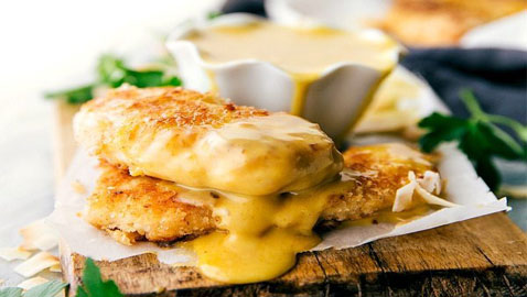 دجاج مقلي بجوز الهند مع صوص الخردل بالعسل